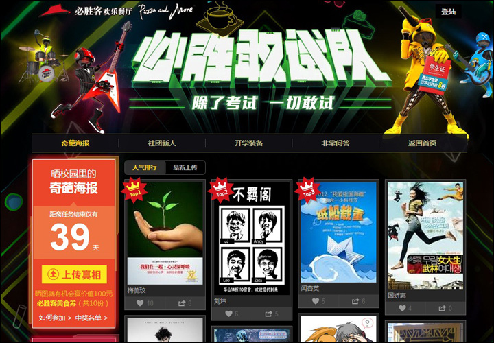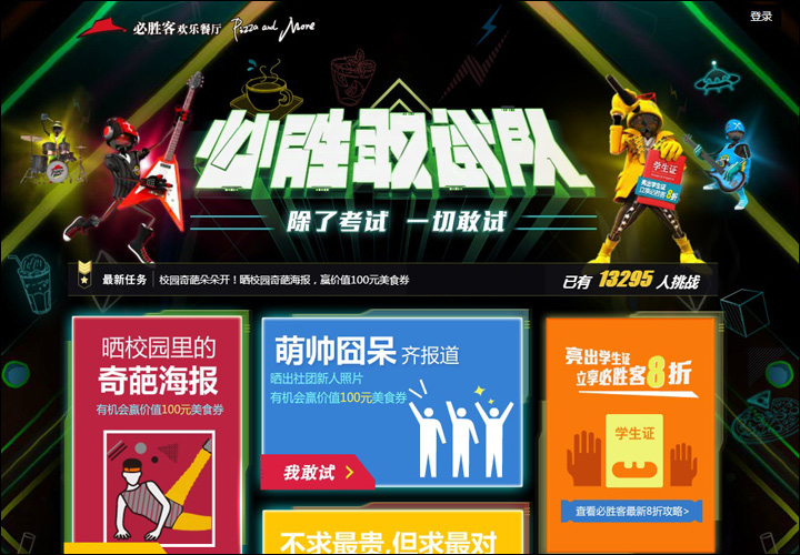 必勝客敢試隊——除了考試,一切敢試!曬校園里的奇葩海報,曬社團新人照片(萌帥呆囧),曬開學裝備,曬個人學生證,在這里沒有你想不到的,只有你不敢試的。參加活動,便有機會獲得必勝客美食券,鼓起勇氣,召喚小伙伴一起來試吧!
