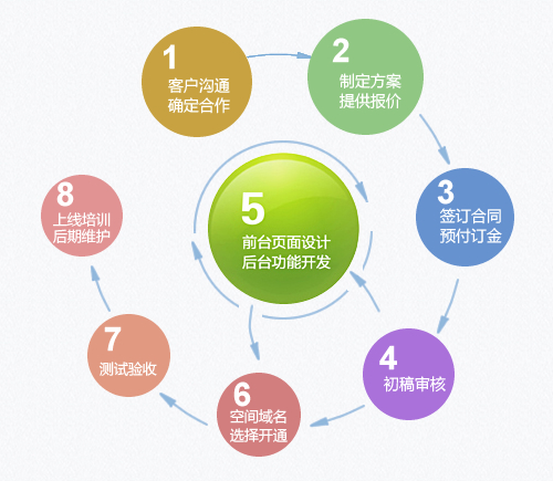 網(wǎng)站建設(shè)流程概述:客戶溝通,確定合作意向→制定建設(shè)方案,提供報價→簽訂合同,預(yù)付定金→初稿審核→前臺頁面設(shè)計,后臺程序開發(fā)→空間及域名選擇、開通→測試驗收→上線培訓,后期維護
